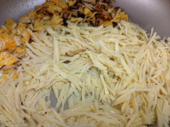 加入切成細絲的冬筍,拌炒至水分稍微收乾