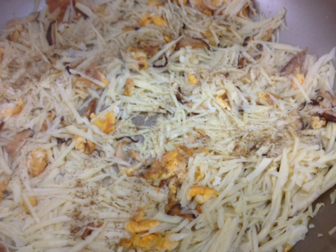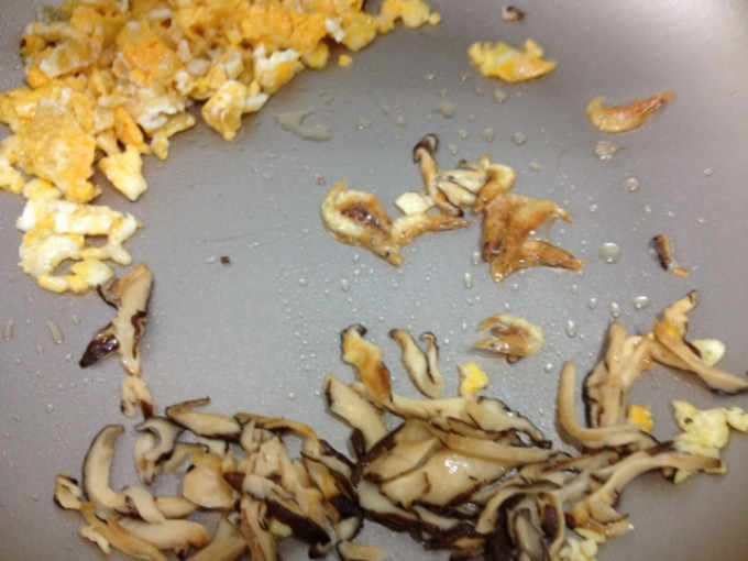 取一小匙油,炒香蛋,切碎,爆香櫻花蝦,香菇絲