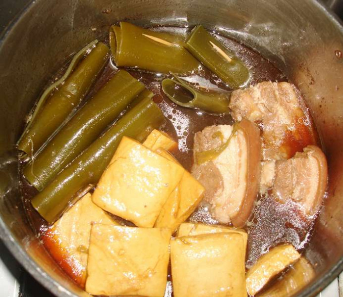 蔥、蒜、冰糖、醬油、三層肉一起下鍋乾燒2-3分鐘,再另燒一鍋熱水,把蛋煮熟後,一起加入鍋中滷至1小時候後,最後海帶、豆干也加入滷至熟成即可...