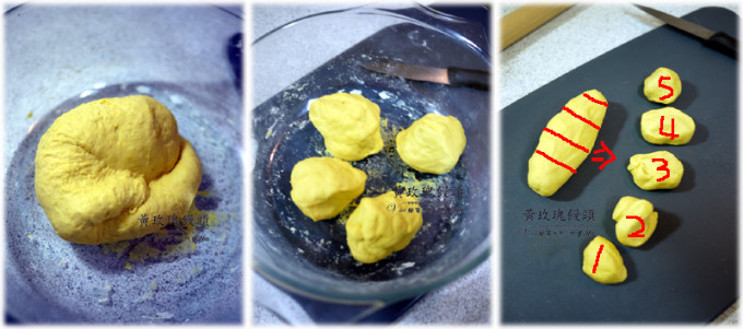 3.取其中一份,接著再分成五等份。第五份的麵團可以小一點