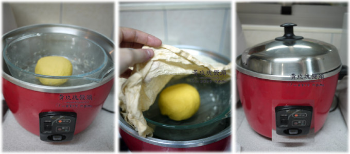 2.把整盤再次放入電鍋裡,用保溫讓它再次發酵20分鐘 (忘了拍蓋上蓋子的照片,保溫發酵時要蓋上蓋上耶)