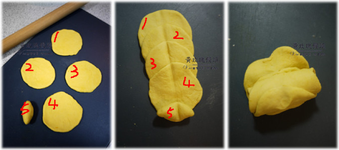 1.把小的那份麵團揉成下面5的長圓型,其餘四等份均桿成水餃皮樣子