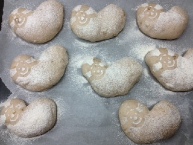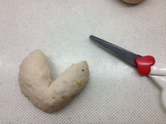 剪刀從麵糰中間向下剪開約2/3的長度,切口翻向下,成心型