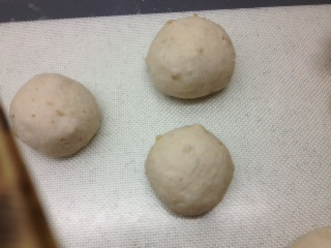 材料投入麵包機,[酵母]投入酵母匣,[核桃]捏小塊投入堅果匣,麵糰模式1小時候取出,分割成8等份,滾圓