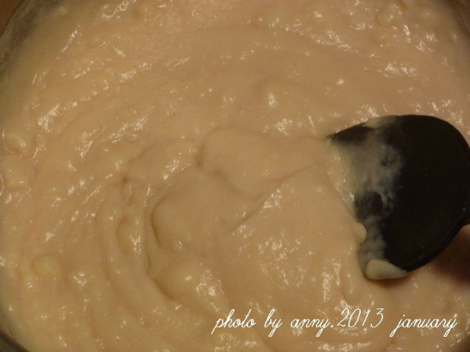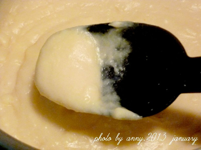 先將打成汁的雞.蝦高湯用小火加熱,慢慢倒入4步驟的粉漿,要一直攪拌~