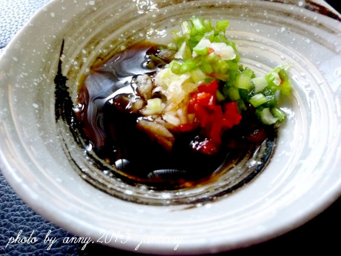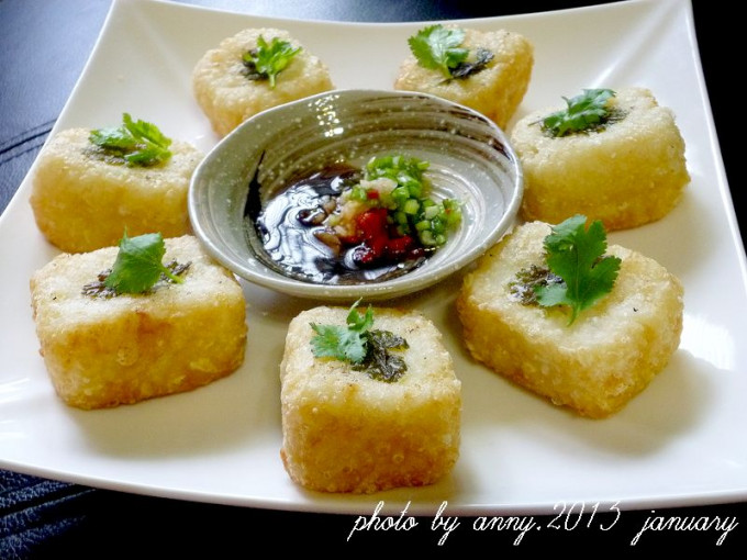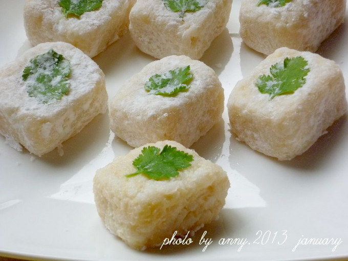 要食用時,將糕渣凍取出切一口適當大小,捏整飯糰,上面放一片香菜葉,再沾上太白粉~