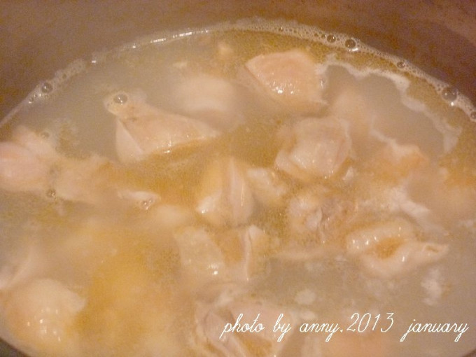 將雞腿肉切小塊,鮮蝦開背去腸泥,水燒開,放入煮30分鐘~