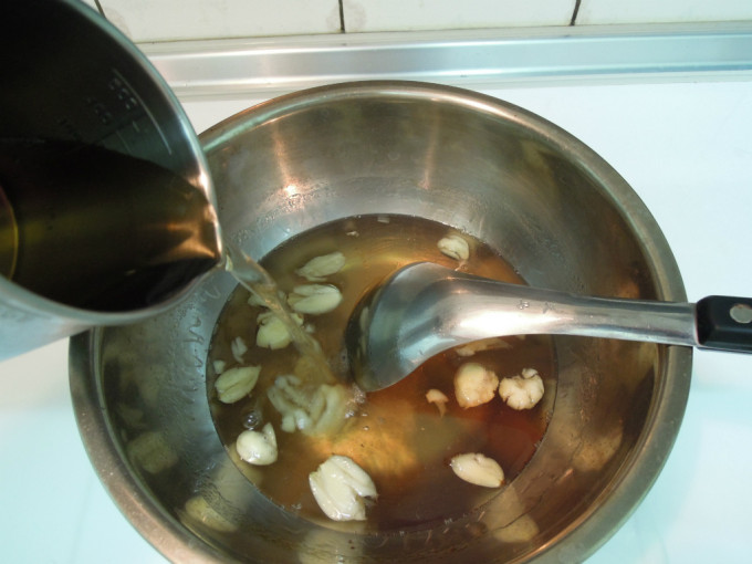 將蒜頭與糯米醋加入做法1中,並熄火,泡到冷卻