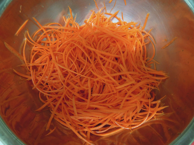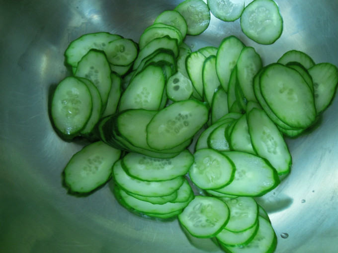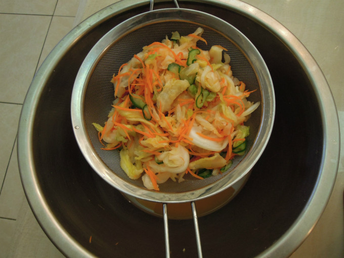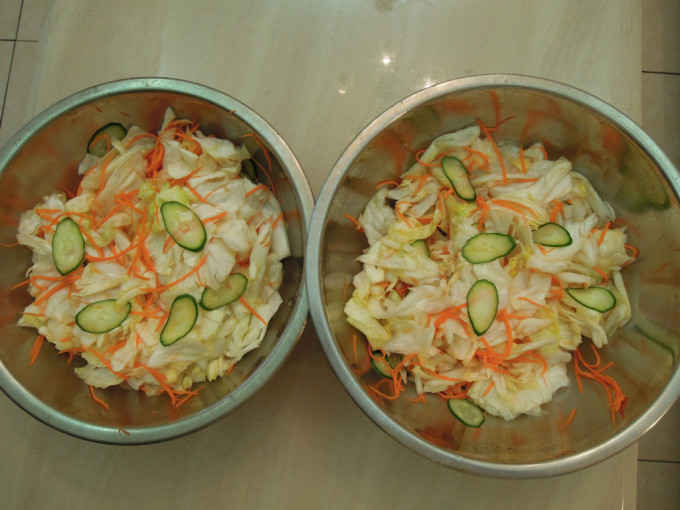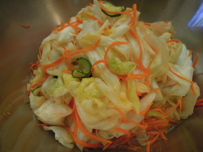 將小黃瓜片與紅蘿蔔絲拌入高麗菜中