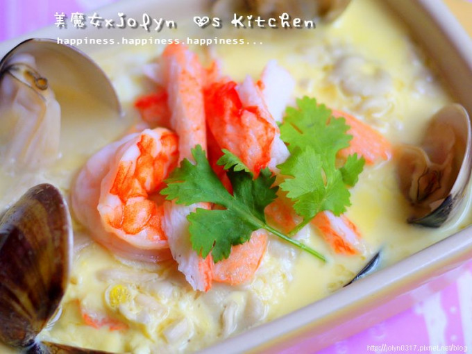 後續再將蛤蜊、蝦仁、蟹棒放入,再蒸7分鐘,完成品是搖晃蛋不會有蛋液滲出