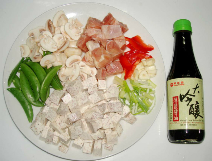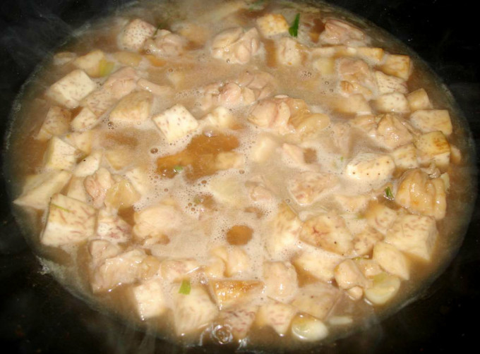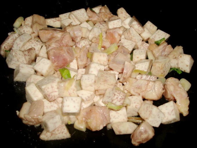 熱鍋倒油,先爆香蔥段、蒜頭,再加入雞腿肉 、芋頭一起拌炒...