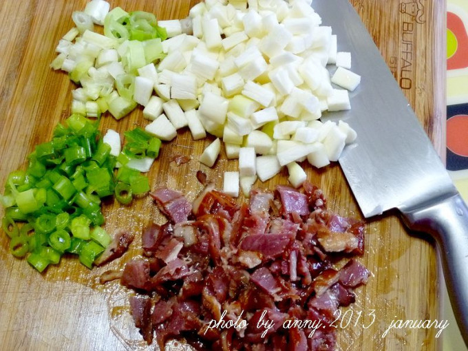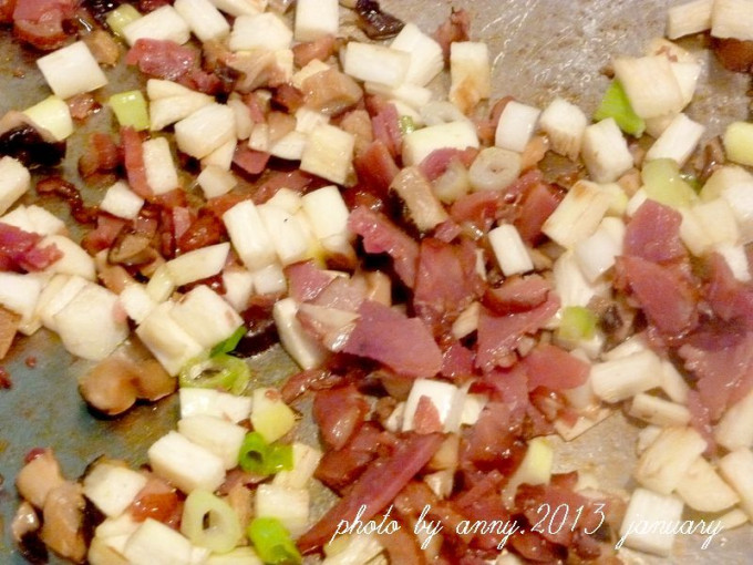 乾香菇泡水後,擰乾切丁,蔥.筊白筍.鴨賞也都切成大小一致的丁狀備用~