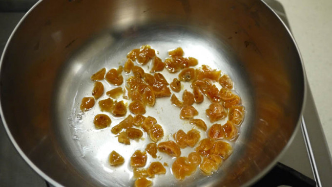 步驟1將宜蘭金桔蜜餞切碎放入20CC水煮軟