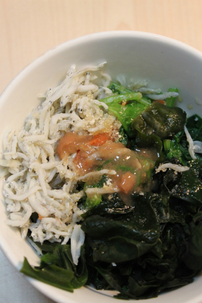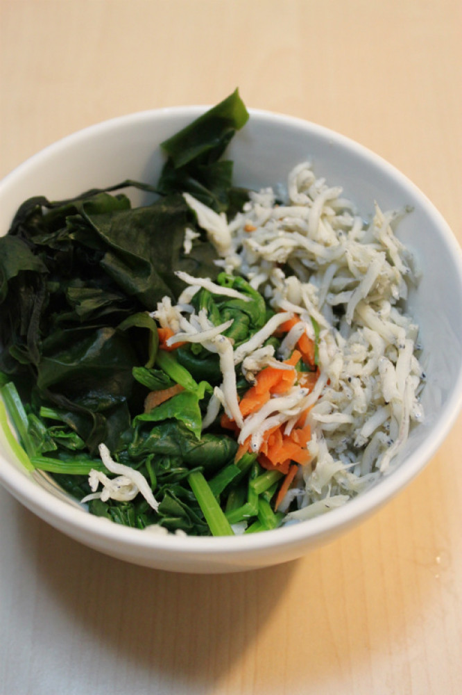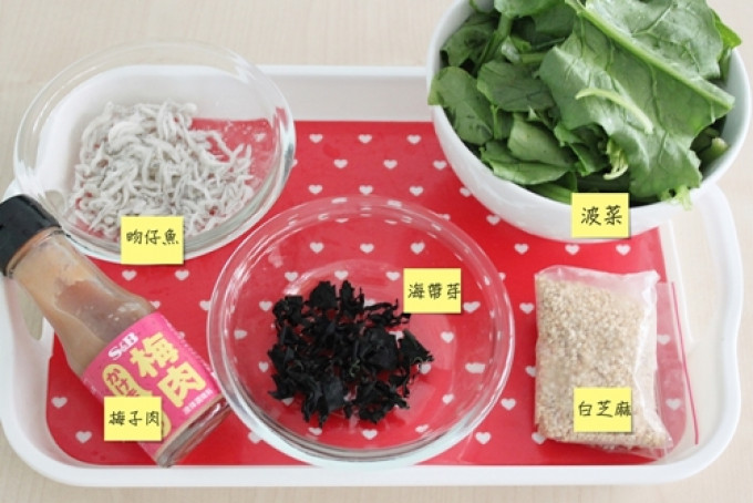 將菠菜、昒仔魚、海帶芽和烤過白芝麻拌在一起,可加紅蘿蔔屑裝飾。