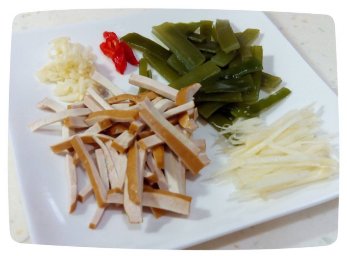 有這些材料..海帶當然不只這些..... 起鍋熱水將海帶燙一燙..在用冷開水洗一下..豆干切絲也要燙一下喔