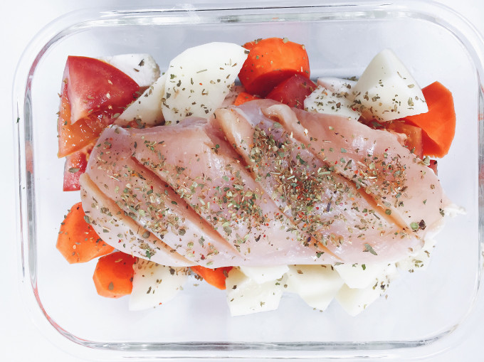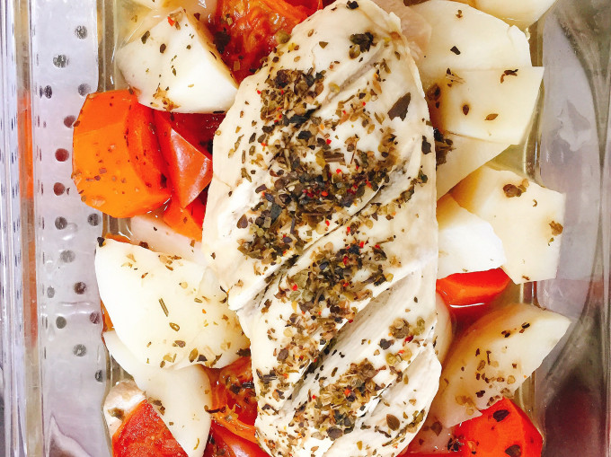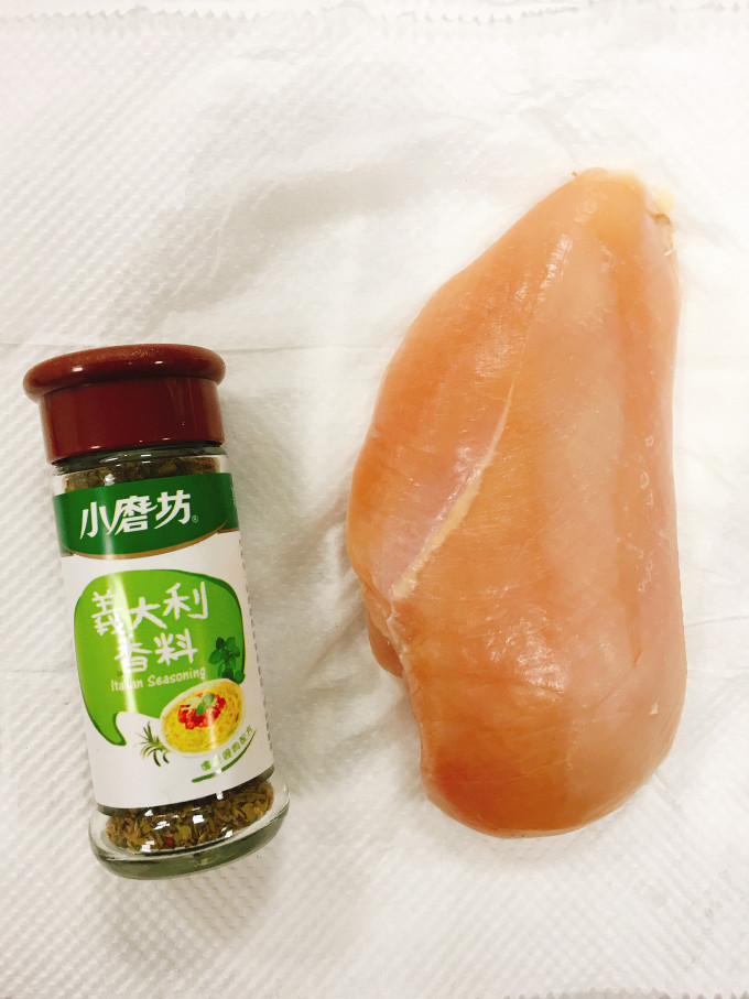 雞胸肉用廚房紙巾壓乾水份 灑上義大利調味粉 雞胸肉順紋理切(不要斷)_滾刀