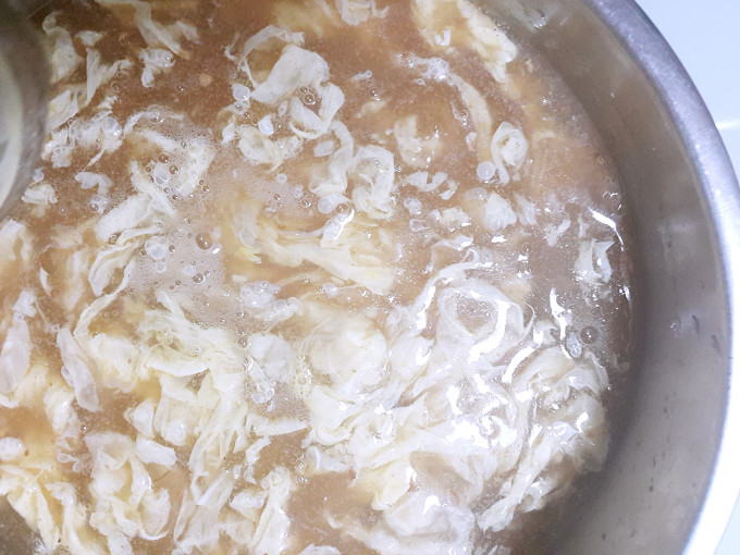 川燙肉條的水直接加入羹湯所有調味料最後勾芡打個蛋花即可