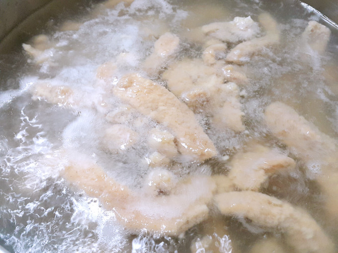 將步驟一加入適量番薯粉拌一拌,準備一鍋水待水滾後將肉條一條一條放入煮至肉條浮起