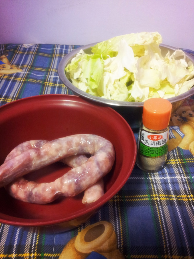 將高麗菜洗淨切成小片狀. 香腸切成一口狀備用!!