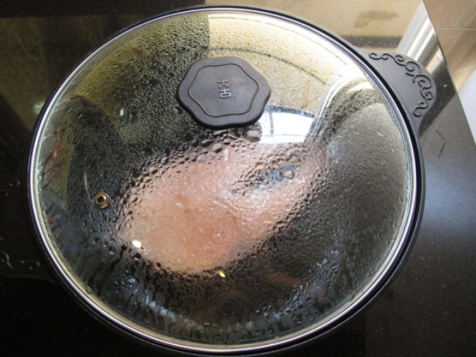蓋上透明鍋蓋,小火悶煎至由紅轉白