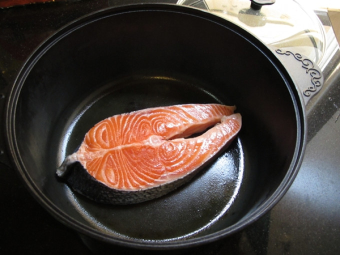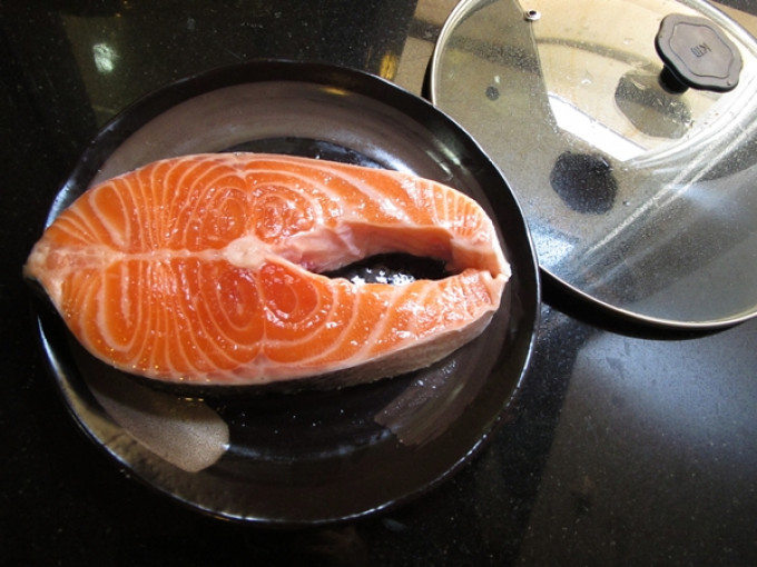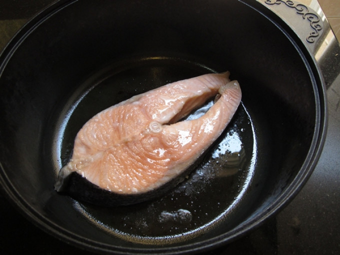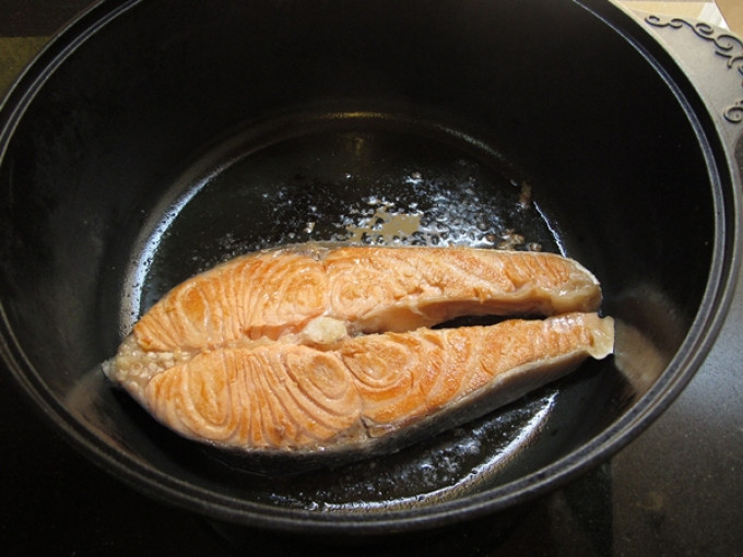 取一,鍋底抹一層薄油,鍋熱後放入鮭魚
