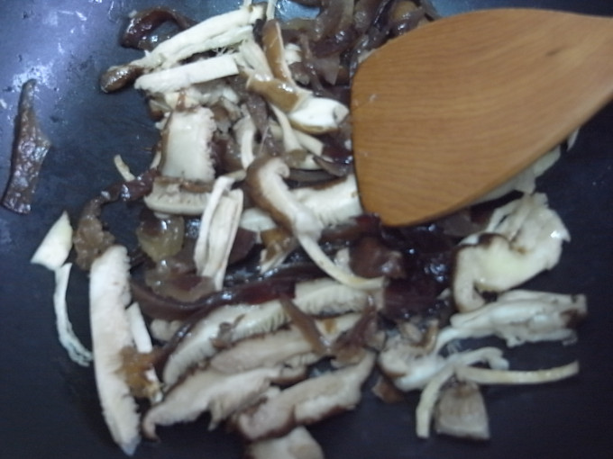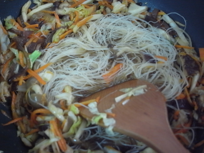再放入米粉拌炒均勻~並加入半杯水,稍微攪拌,蓋上鍋蓋悶5分鐘~