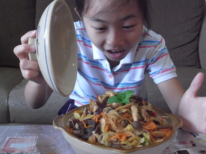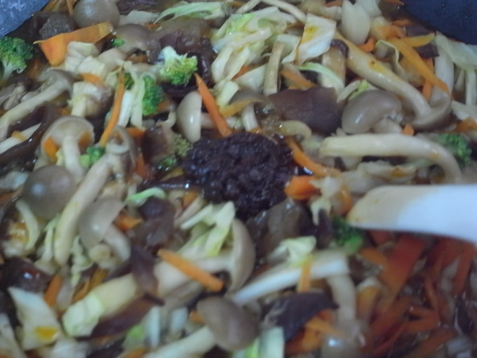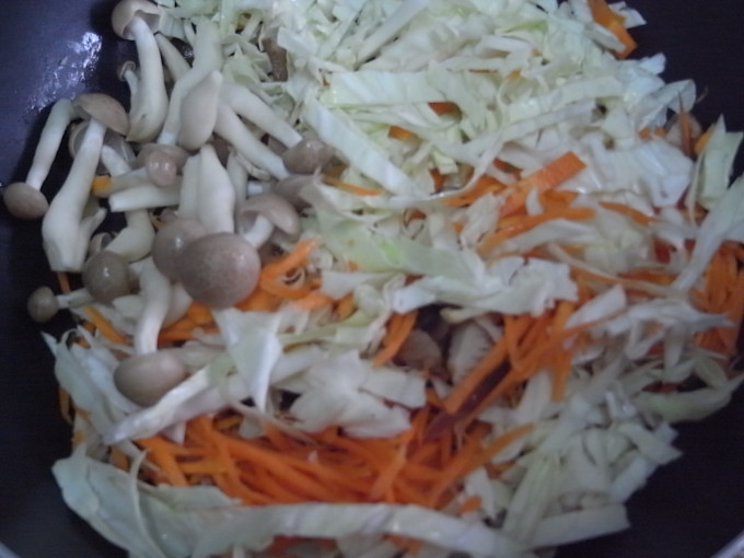 接著放入高麗菜與紅蘿蔔絲,鴻喜菇並均勻拌炒。