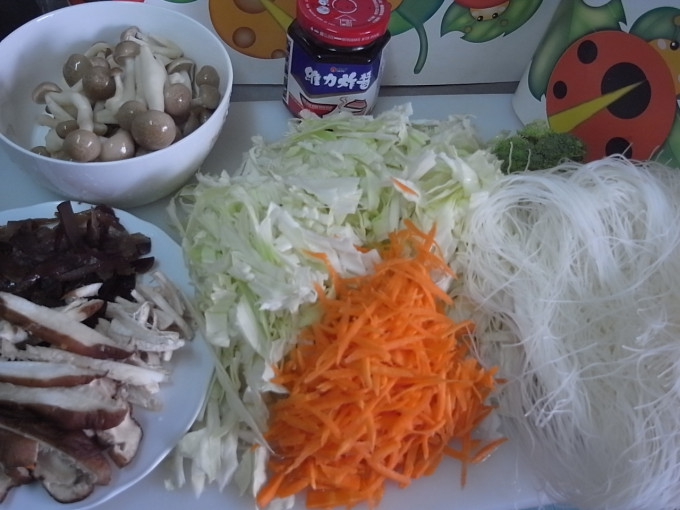 所有食材先洗淨~ 高麗菜洗淨切好, 紅蘿蔔切絲 , 香菇泡水後洗淨瀝乾, 切條狀, 鴻喜菇洗淨切除蒂頭, 剝小瓣 / 米粉泡軟瀝乾水份備用~