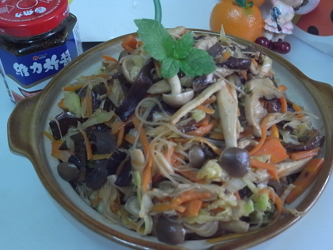 備齊所有食材~ 『維力炸醬』2大 匙 / 市售米粉一包 /高麗菜 1/4顆 / 紅蘿蔔半條 /生香菇3-4朵/鴻喜菇一包 / 黑木耳少許肉絲/ 芹菜少許/ 青花椰菜少許 ..