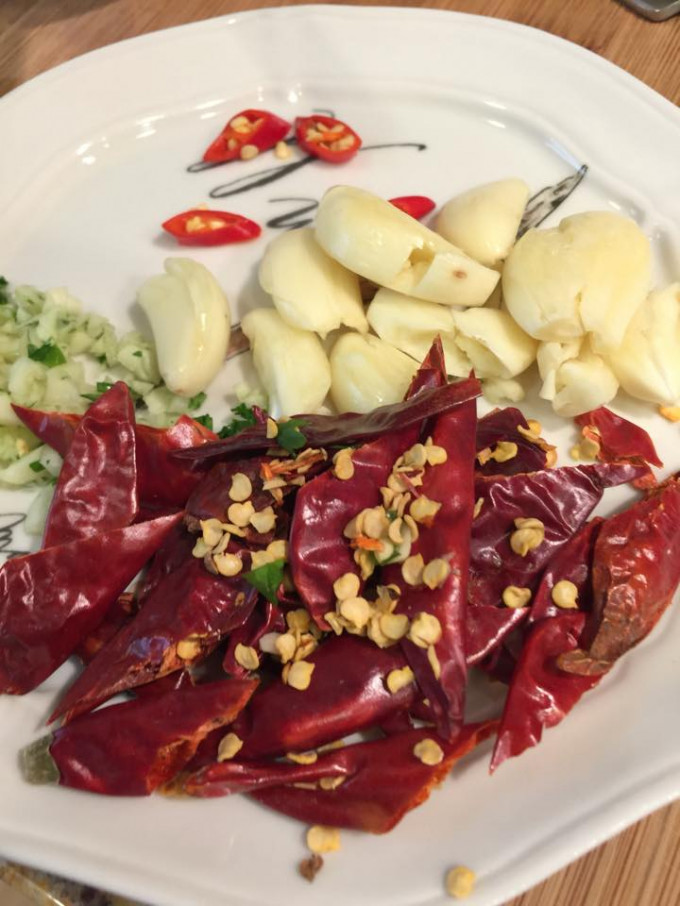 高麗菜洗淨切好, 乾辣椒斜切, 蒜頭拍碎備用