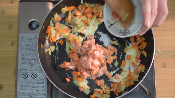 加入蛋白、鮭魚丁繼續拌炒。 (鮭魚可先用檸檬、胡椒、鹽稍微醃漬)