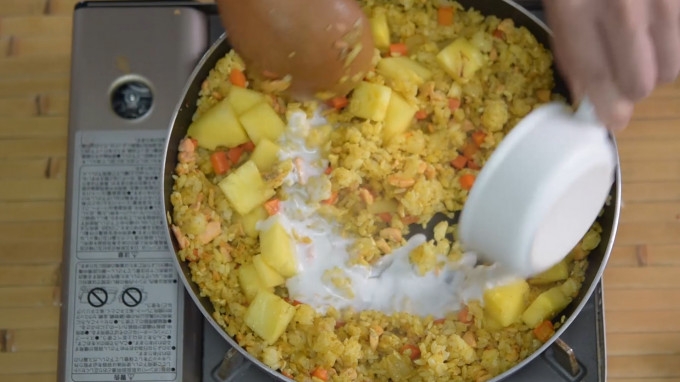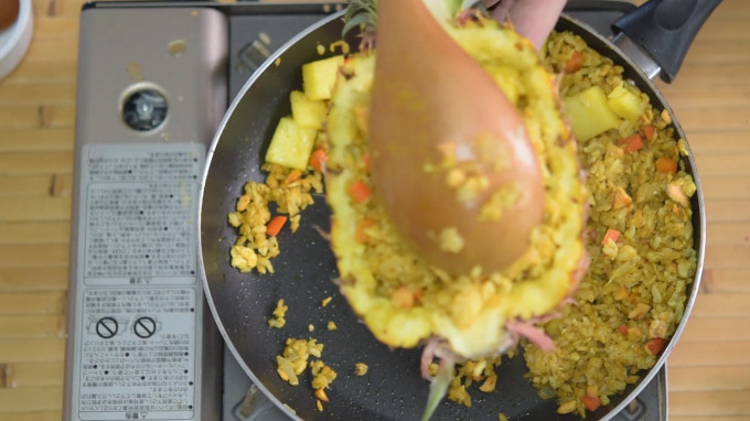 接著加入鳳梨塊、椰漿兩大匙,繼續拌炒。