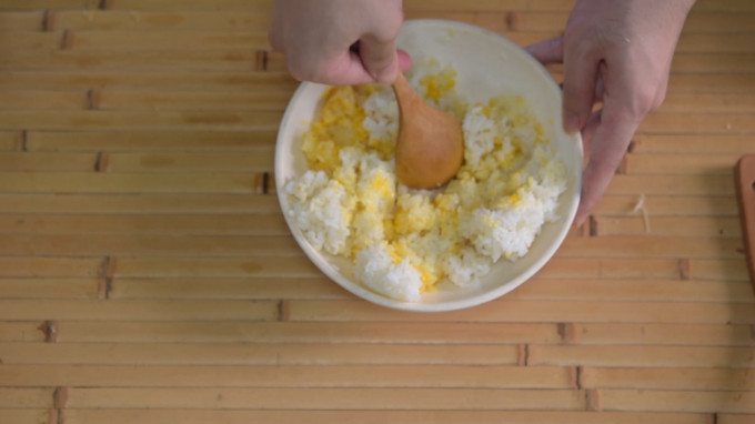 隔夜飯拌入蛋黃、鹽巴。