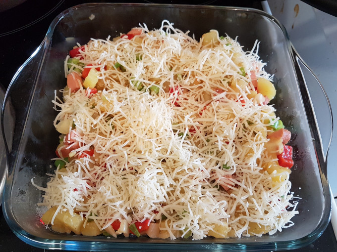 撒上一層起司碎屑,倒入蛋液,再撒上一層起司屑。