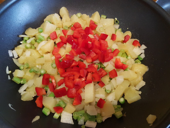 以上三項快熟時最後再加紅甜椒、鹽、白胡椒粉,稍微翻炒後起鍋。