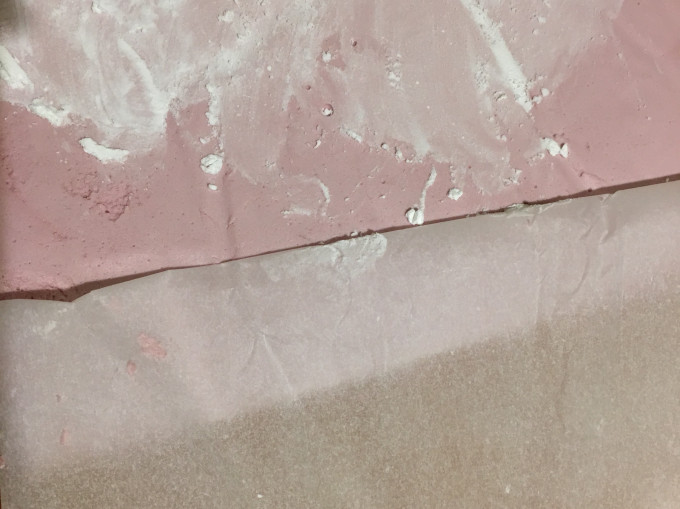 這是我在材料行買的油紙,非常不沾黏。看步驟6撕下來的部分幾乎沒有沾黏棉花糖。