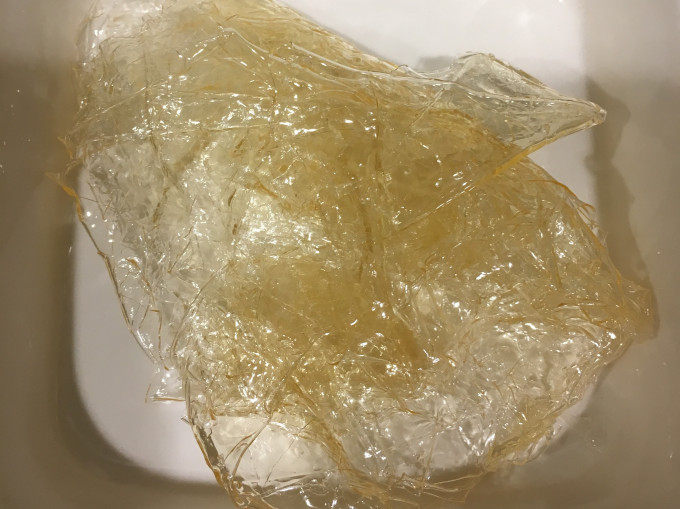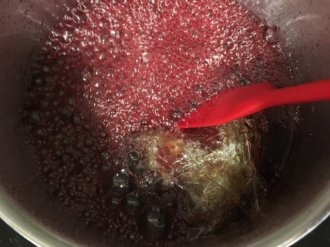 煮沸達110度後熄火,快速放人吉利丁片與20g玉米糖漿。然後以攪拌機快速攪拌