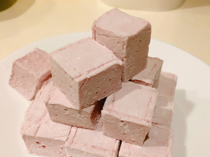 取出凝固的棉花糖,表面先撒上熟玉米粉,然後除去油紙,之後切塊並拍上熟玉米粉。