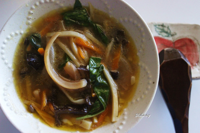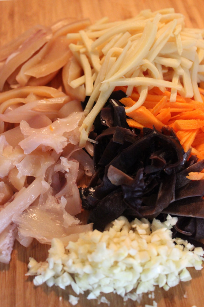 魷魚泡發~將魷魚放入蓋過魷魚的水量中加一小匙鹽~泡發至自己喜愛的柔軟度我泡了3小時~因家中有小孩所以這口感帶彈性但還咬的下去~蔬菜類切絲備用