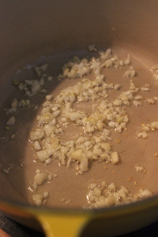 鍋中下少許油炒香蒜頭~讓蒜頭炒到淡淡的褐色香氣釋放