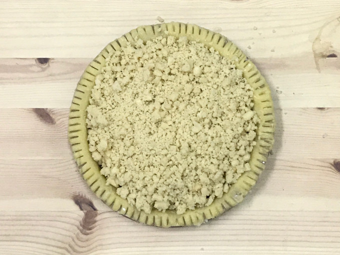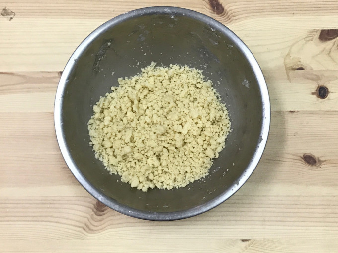 酥菠蘿:將奶油切丁放入冷凍庫變硬,取出再加入其他材料,用攪拌器絞碎後再稍微搓成細粉狀