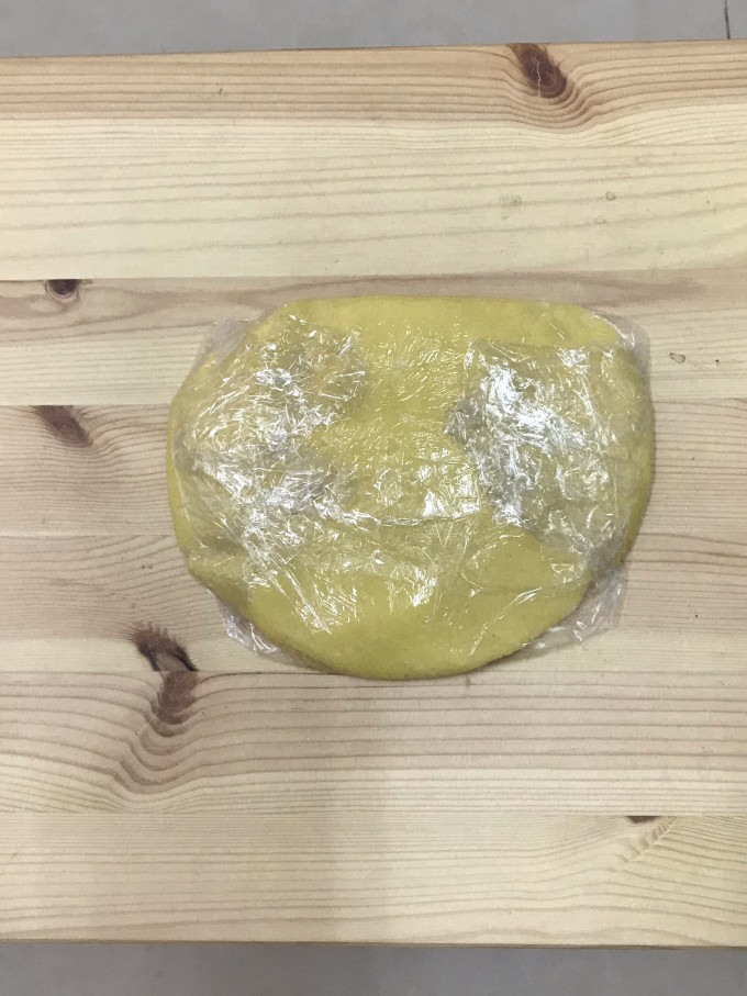 倒在保鮮膜上,稍微聚攏壓實,再摺疊三~四次沒看到麵粉後,就用保鮮膜包起來(不要再用手揉),放入冰箱冷藏至少30分鐘