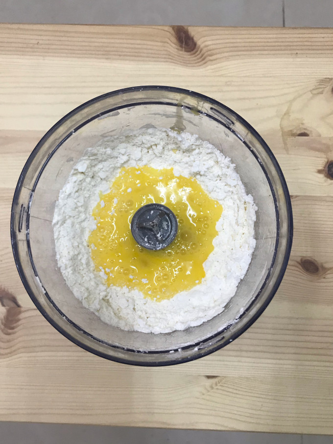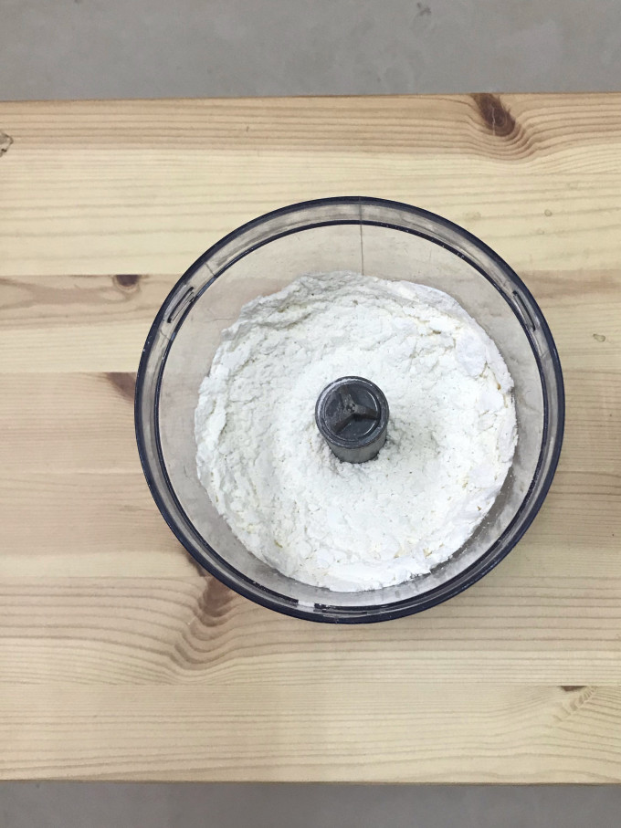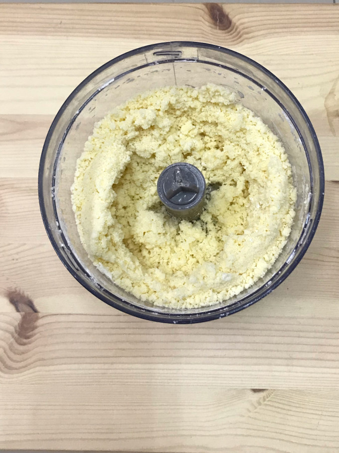 先做塔皮:奶油切丁裹麵粉,將麵粉、糖放到食物攪拌機稍微攪拌一下,再放入奶油,也稍微攪碎。
