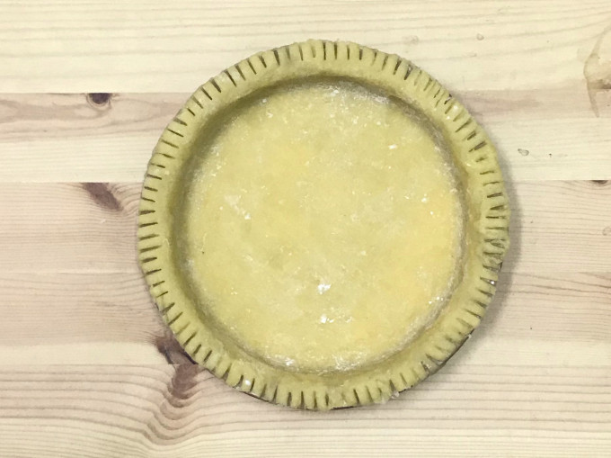將冷藏的派皮壓薄約3mm厚的圓型,先放回冰箱冷藏30分鐘,攤開在放入6寸派盤,稍微修邊