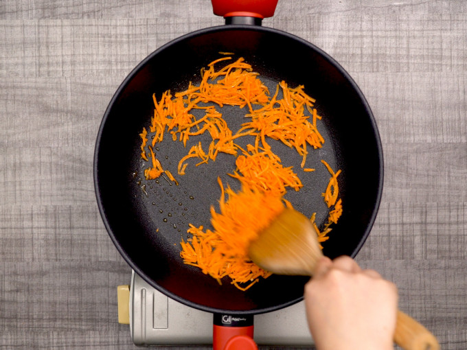 鍋中下麻油,放入紅蘿蔔絲拌炒。