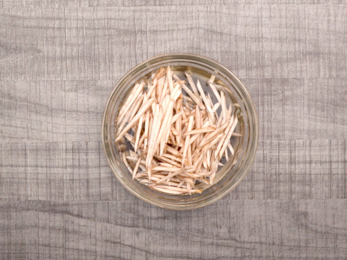 清水中加入白醋,將牛蒡絲倒入水中浸泡,以防止牛蒡絲變色。
