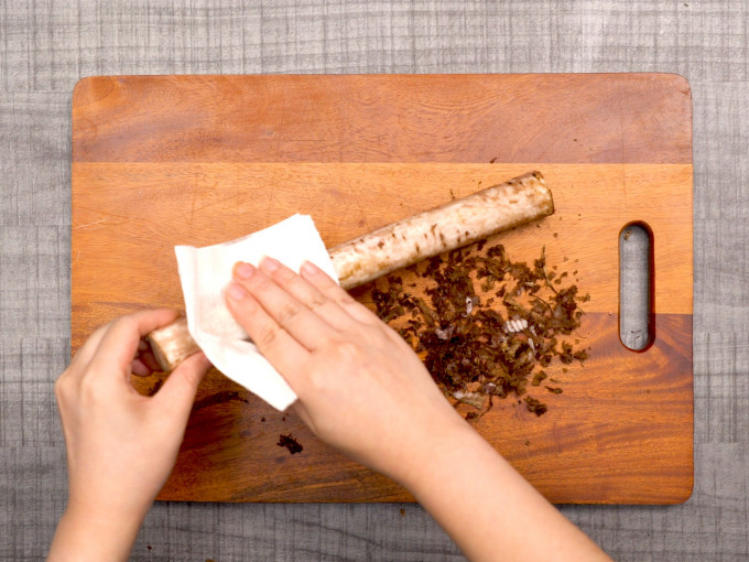 用沾有白醋的紙巾擦拭表面,再將牛蒡切成絲狀。