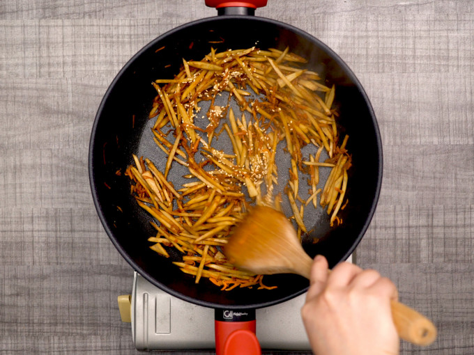 放入擦乾的牛蒡絲拌炒至軟,下醬油、味醂拌炒入味。