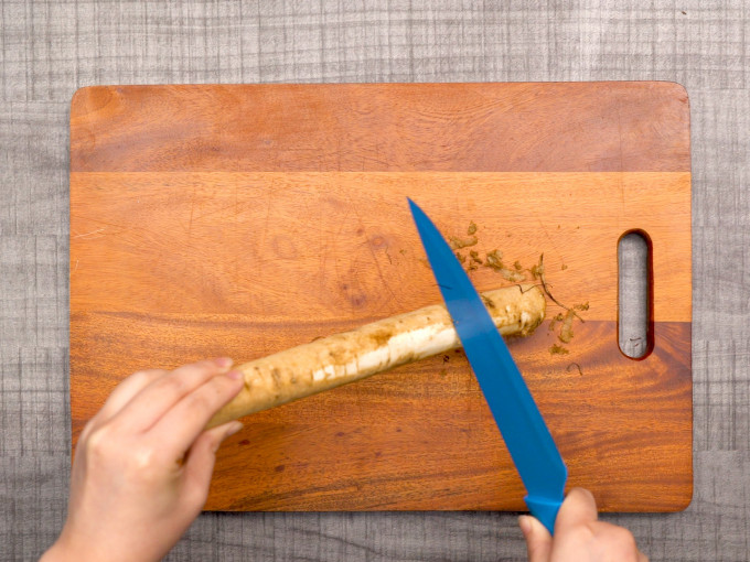 將牛蒡洗淨後,用刀背將外皮刮除。