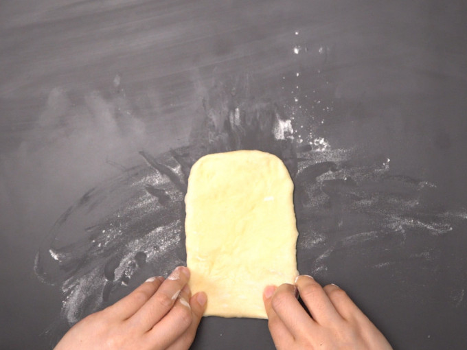 將麵團擀平成橢圓形,翻面,再把麵團的四角拉開成長方形狀,並由上往下捲起。